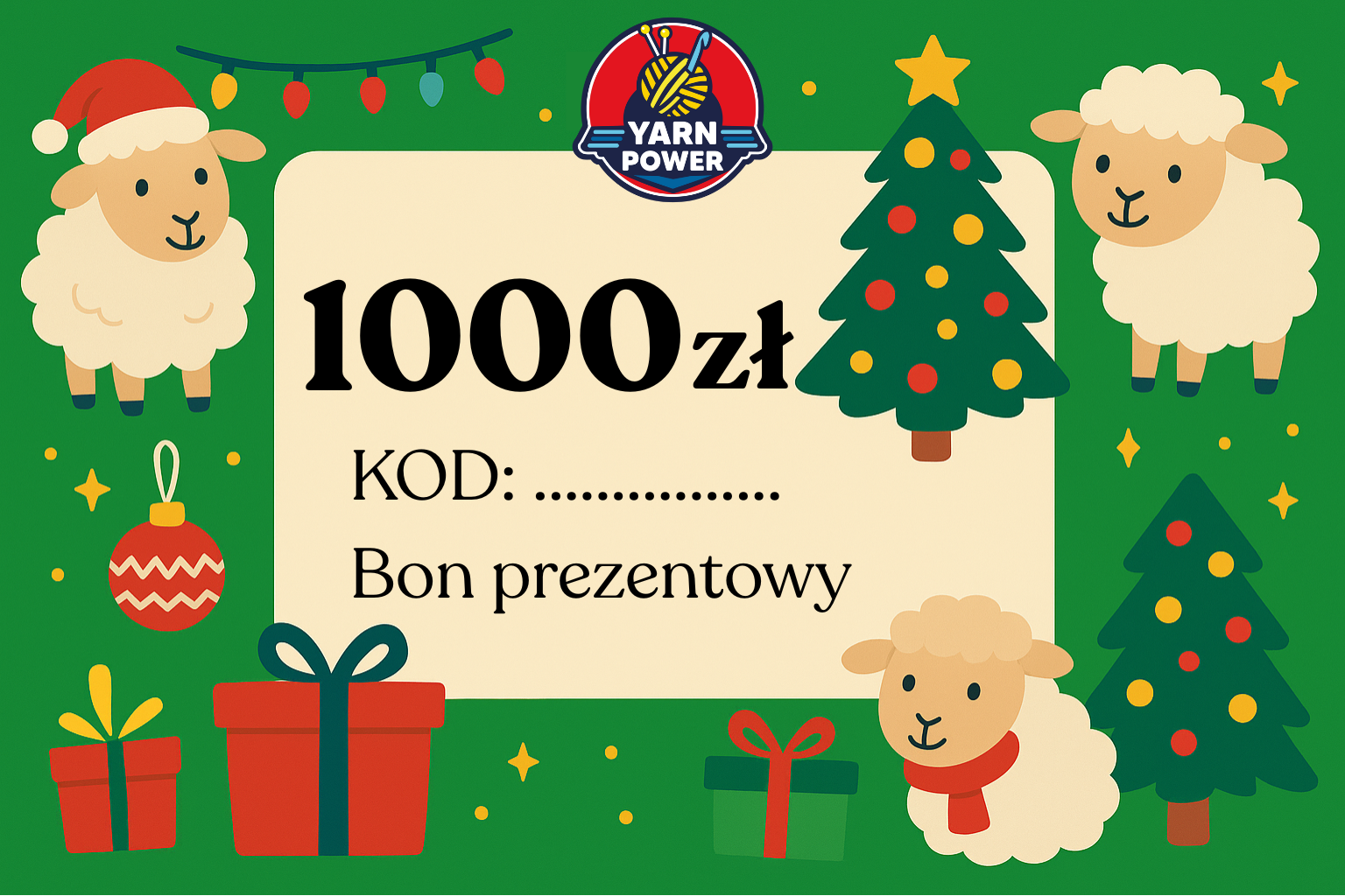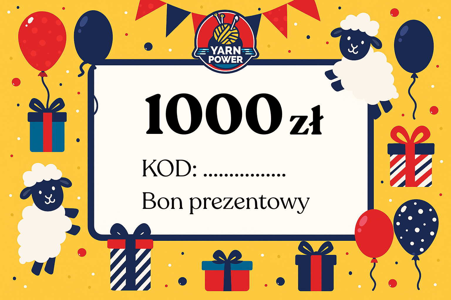 Bon prezentowy YarnPower o wartości 1000 złotych - Idealny prezent dla osoby, która kocha włóczkę, druty i szydełko. Cyfrowy bon prezentowy o wartości 1000 zł – kod wysyłamy e-mailem w ciągu 1 dnia roboczego, bon jest ważny 12 miesięcy, do wykorzystania online, stacjonarnie i na targach.