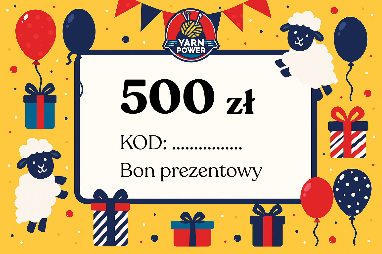 Bon prezentowy YarnPower o wartości 500 złotych - Idealny prezent dla osoby, która kocha włóczkę, druty i szydełko. Cyfrowy bon prezentowy o wartości 500 zł – kod wysyłamy e-mailem w ciągu 1 dnia roboczego, bon jest ważny 12 miesięcy, do wykorzystania online, stacjonarnie i na targach.