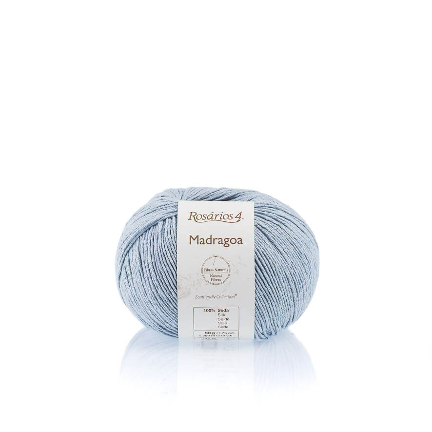 Włóczka Madragoa pochodzi od portugalskiego producenta Rosarios 4 i jest częścią ich kolekcji przyjaznej dla środowiska. Surowy jedwab bourette, z którego powstaje włóczka Rosarios 4 Madragoa, wytwarzany jest z wyczesanych i ponownie przetworzonych kokonów jedwabnika morwowego po tym jak dorosłe owady już je opuściły. Recyklingowane włókna jedwabne są dość krótkie, ich struktura jest nierówna, a nowo uprzędziona włóczka pozostaje rustykalna, matowa, lekko guzełkowata i tweedowa - wygląda więc nieco inaczej niż produkt, który wyobrażamy sobie mają na myśli jedwab, ale na szczęście nie ma to wpływu na wspaniałe właściwości użytkowe tej przędzy.
