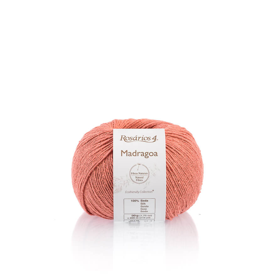 Włóczka Madragoa pochodzi od portugalskiego producenta Rosarios 4 i jest częścią ich kolekcji przyjaznej dla środowiska. Surowy jedwab bourette, z którego powstaje włóczka Rosarios 4 Madragoa, wytwarzany jest z wyczesanych i ponownie przetworzonych kokonów jedwabnika morwowego po tym jak dorosłe owady już je opuściły. Recyklingowane włókna jedwabne są dość krótkie, ich struktura jest nierówna, a nowo uprzędziona włóczka pozostaje rustykalna, matowa, lekko guzełkowata i tweedowa - wygląda więc nieco inaczej niż produkt, który wyobrażamy sobie mają na myśli jedwab, ale na szczęście nie ma to wpływu na wspaniałe właściwości użytkowe tej przędzy.