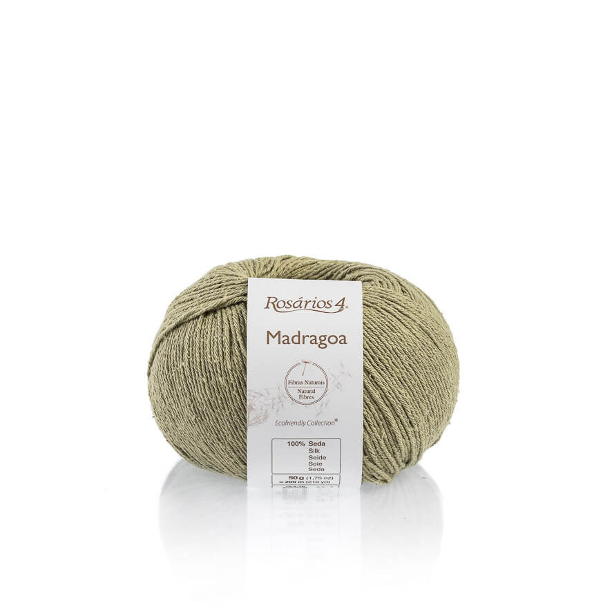 Włóczka Madragoa pochodzi od portugalskiego producenta Rosarios 4 i jest częścią ich kolekcji przyjaznej dla środowiska. Surowy jedwab bourette, z którego powstaje włóczka Rosarios 4 Madragoa, wytwarzany jest z wyczesanych i ponownie przetworzonych kokonów jedwabnika morwowego po tym jak dorosłe owady już je opuściły. Recyklingowane włókna jedwabne są dość krótkie, ich struktura jest nierówna, a nowo uprzędziona włóczka pozostaje rustykalna, matowa, lekko guzełkowata i tweedowa - wygląda więc nieco inaczej niż produkt, który wyobrażamy sobie mają na myśli jedwab, ale na szczęście nie ma to wpływu na wspaniałe właściwości użytkowe tej przędzy.