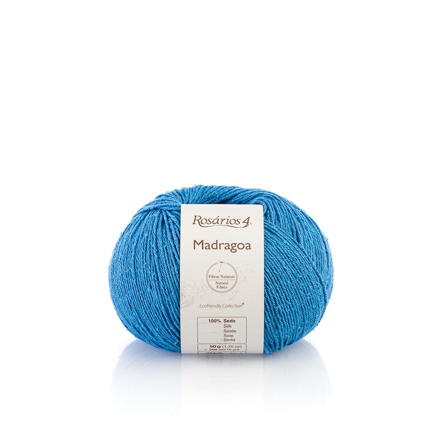 Włóczka Madragoa pochodzi od portugalskiego producenta Rosarios 4 i jest częścią ich kolekcji przyjaznej dla środowiska. Surowy jedwab bourette, z którego powstaje włóczka Rosarios 4 Madragoa, wytwarzany jest z wyczesanych i ponownie przetworzonych kokonów jedwabnika morwowego po tym jak dorosłe owady już je opuściły. Recyklingowane włókna jedwabne są dość krótkie, ich struktura jest nierówna, a nowo uprzędziona włóczka pozostaje rustykalna, matowa, lekko guzełkowata i tweedowa - wygląda więc nieco inaczej niż produkt, który wyobrażamy sobie mają na myśli jedwab, ale na szczęście nie ma to wpływu na wspaniałe właściwości użytkowe tej przędzy.